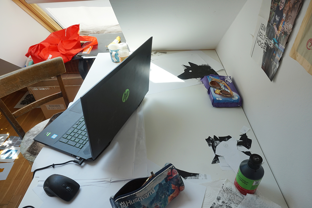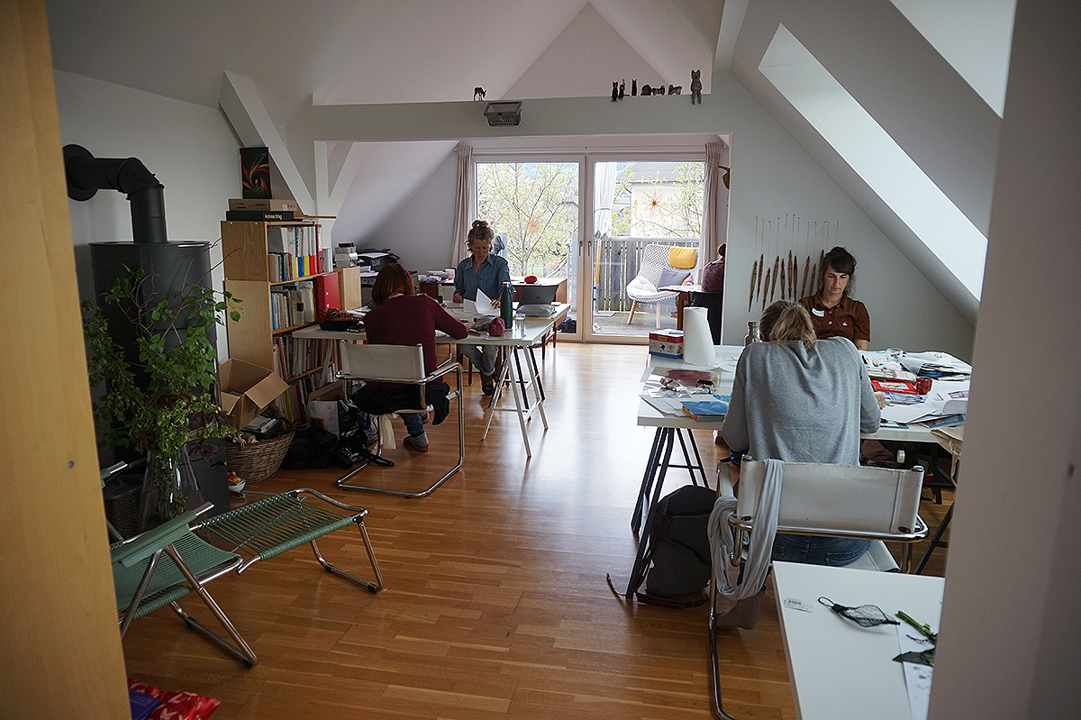 Alle Plätze besetzt, bis zum letzten Tisch – tolle Arbeitsstimmung, intensive Gespräche, auch abseits der Buchbesprechungen im Plenum, und darüber hinaus auch viel Spaß. Ganz gleich welches Wetter draußen ist, drinnen in den Räumen sind die Ideen und Gedanken förmlich greifbar und die Abschlusspräsentation entsprechend interessant. Ob gemalt, gedruckt, collagiert oder in einer anderen Technik erstellt, neben dem Illustrieren gabs auch Muße, um Bücher zu genießen oder gemütlich zu recherchieren.