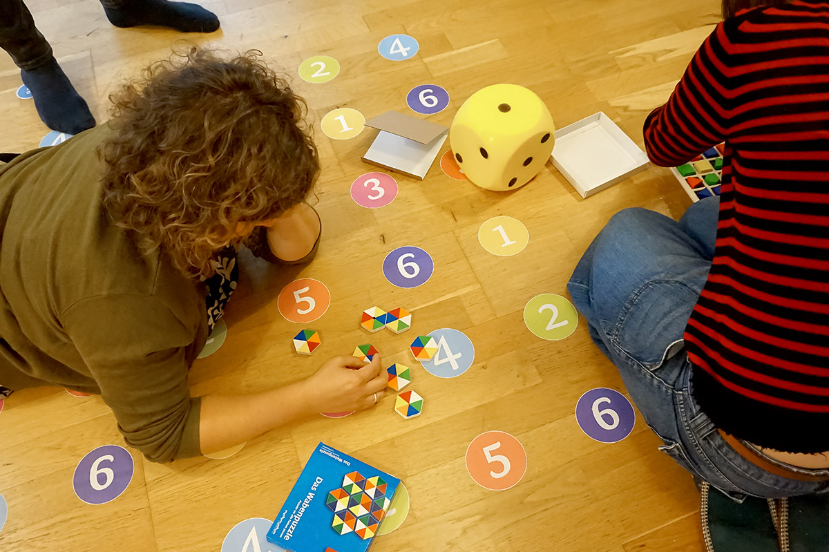 Neben der Beteiligung des Teams am Bau der Ausstellung ist die Teamschulung kurz vor Eröffnung der neuen interaktiven Ausstellung ein wichtiger Termin, um ins Thema »1-2-3-viele – alle zählen« einzutauchen: als Einführung in die einzelnen Themenbereiche und Stationen der Ausstellung, andererseits zum Austausch untereinander – im Lauf des Jahres sieht sich das Team kaum, wenn auch alle über diverse digitale Kanäle verbunden sind. Spielen, ausprobieren, tüfteln, es hat Spaß gemacht.