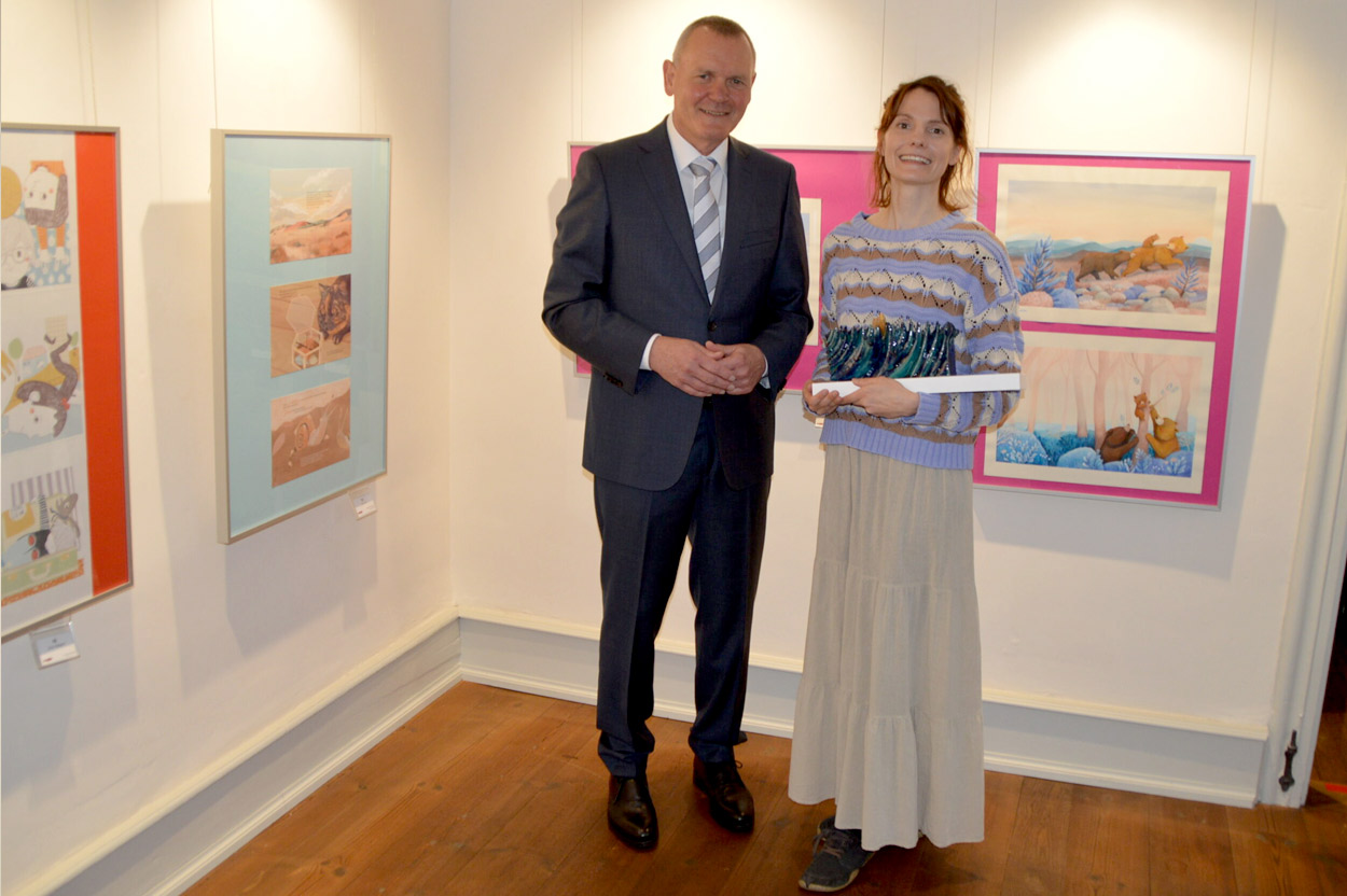 Nicht nur die Fachjury beim 11. Meefisch- Bilderbuchillustrationspreis, der alle zwei Jahre mit der Intention Kinder früh an gut gemachte Bilderbücher heranzuführen, konnte Agi Ofner mit ihrem Bilderbuch-Projekt „Ganz bestimmt Bärenkind“ auf ganzer Linie überzeugen. Auch die Besucherinnen und Besucher der Ausstellung und die ganz jungen Leserinnen und Leser waren begeistert und holte sie sich auch gleich noch den Meefisch-Publikums- und Kinderjurypreis. Wir gratulieren sehr herzlich! Die 20 Illustrations-Projekte der Meefisch-Finalisten können noch bis Sonntag, den 4. Januar 2026 in Marktheidenfeld bestaunt werden.