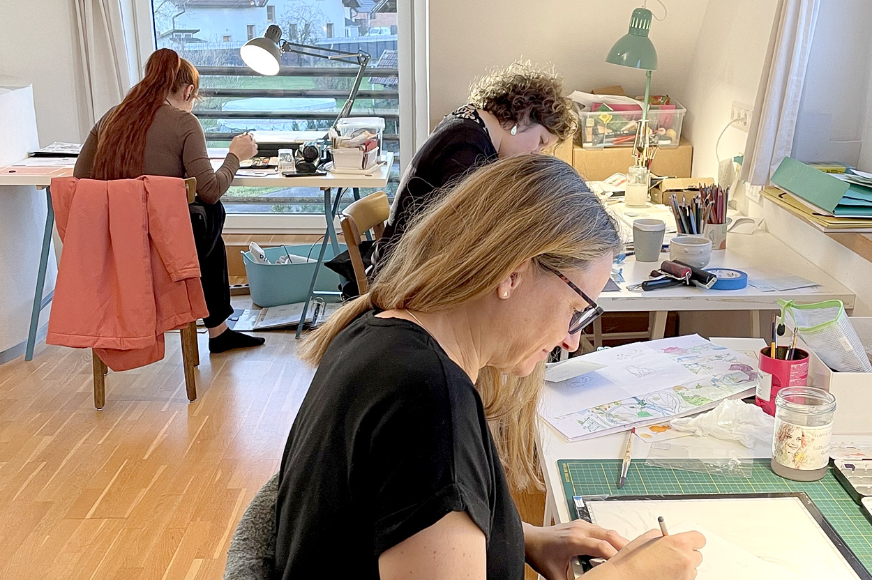 Mit den Dritt-Impulsen endete der Lehrgang Illustration 2024–2025. Es waren intensive Tage an den Arbeitstischen, mit begonnenen, aber auch neuen Projekten und einem Besuch von Verena Hochleitner und Mo Aufderhaar, die auch gleich ihr neues Buch „Was tun, wenn“https://kunstanstifter.de/buecher/was-tun-wenn vorgestellt haben. Ein bisschen Abschiedsschmerz, ein wunderschönes Abschiedsgeschenk und ein kleiner Abschiedsschmaus durften natürlich auch nicht fehlen. Und keine Sorge, schon im Jänner startet unser neuer Lehrgang mit den Bildimpulsen und der Arbeit am eigenen Projekt.