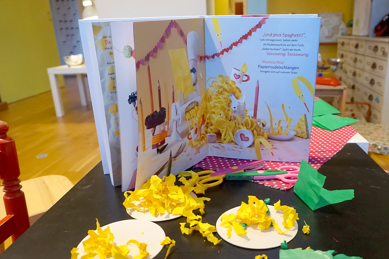 Unsere MITMACH-AUSSTELLUNG – von leichten Schnipselnudeln mit Papierkugerl-Erbsen bis zu schwerem Gekreisel