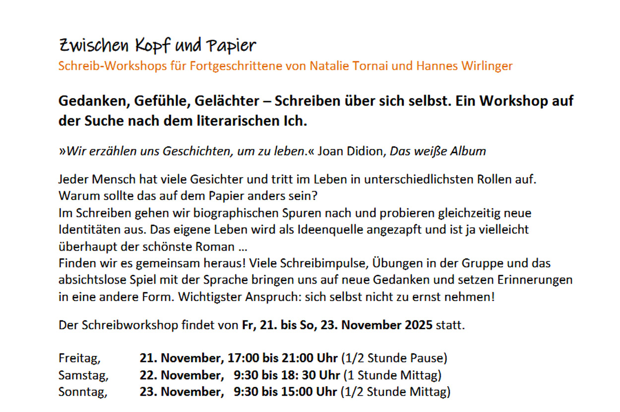 Hannes Wirlinger veranstalten immer wieder Schreibworkshops in Wien. So auch von Fr, 21. bis So, 23. November. Dieses Mal dreht sich alles um Gedanken, Gefühle und Gelächter, das Schreiben über sich selbst. Wer sich in gemütlicher Atmosphäre unter sowohl fachkundiger als auch entgegenkommender Leitung mit einer Gruppe Gleichgesinnter auf die Suche nach dem literarischen Ich begeben möchte, kann sich hier noch