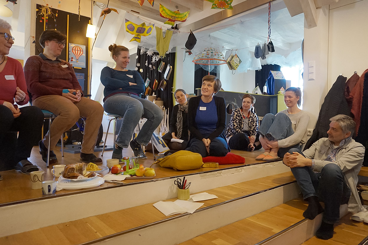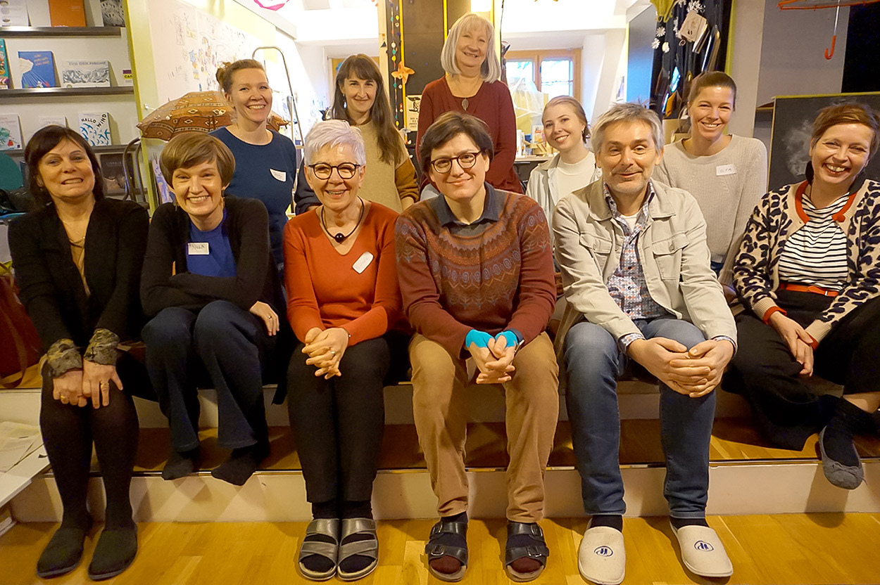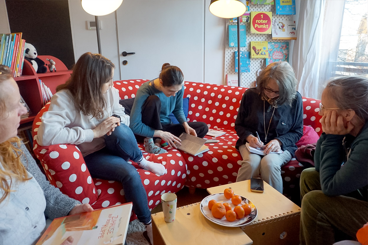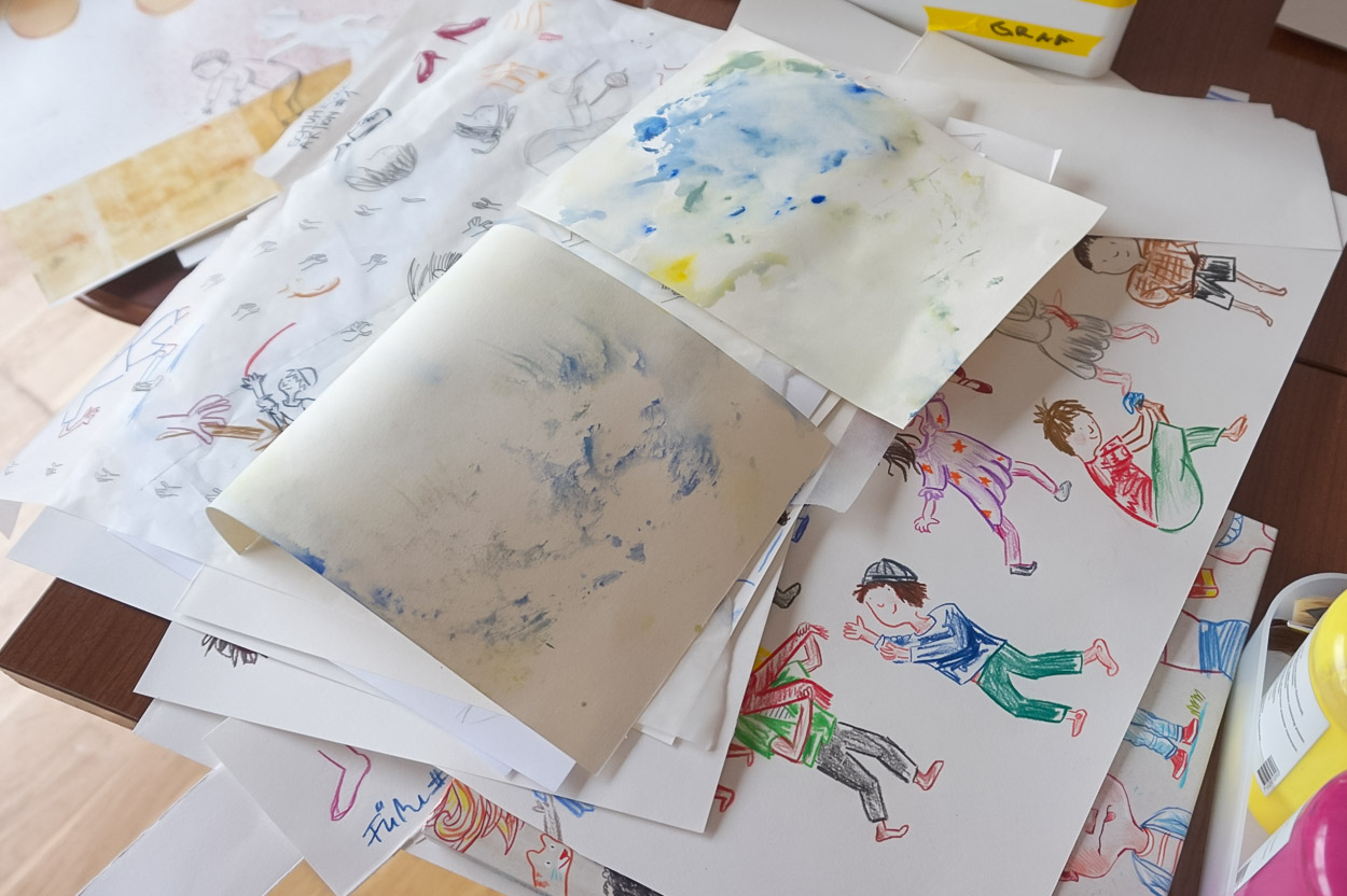 unser neuer Lehrgang »Die Kunst der Illustration: Kinderliteratur«. Ob kleine Aufwärmübungen zum Tagesbeginn, das Vorstellen mitgebrachter Lieblingsbücher, genaues Betrachten unterschiedlicher Techniken und Materialien in Bilderbüchern unserer Präsenzbibliothek oder das Experimentieren mit Drucktechniken. Unser Lehrgang bot viele Anregungen, die unseren neuen Teilnehmerinnen zu ersten Entscheidungsfindungen rund um das eigene Buchprojekt inspirierten. Wir sind schon sehr gespannt und freuen uns auf die Illustrationen zu Gedichten, Liedern und Märchen, die in den nächsten zwei Jahren wachsen und entstehen werden.