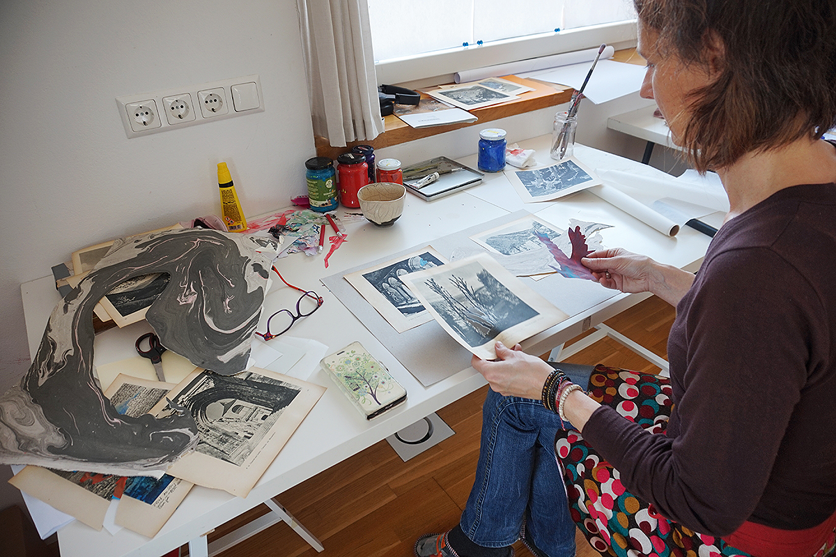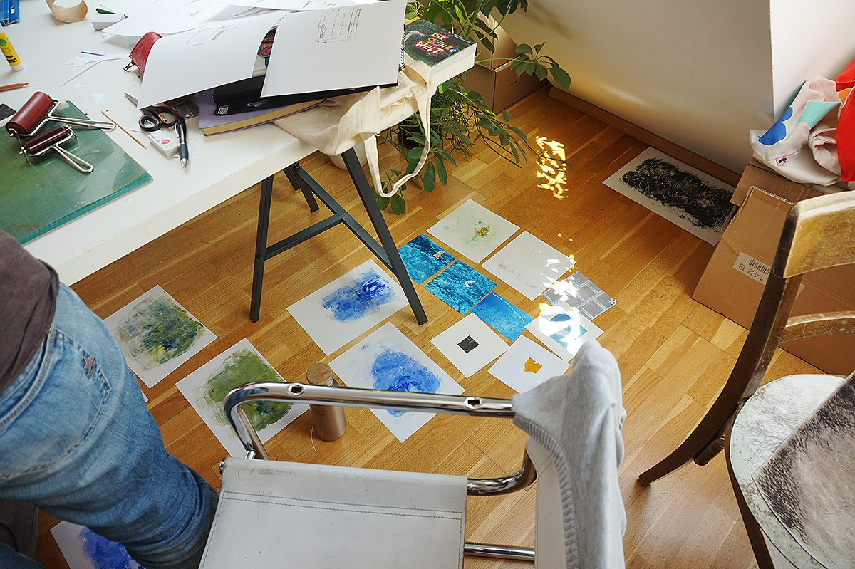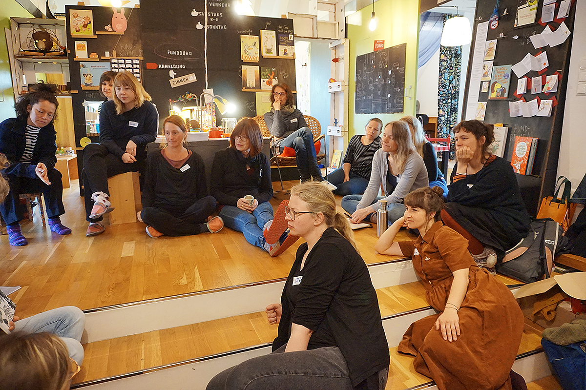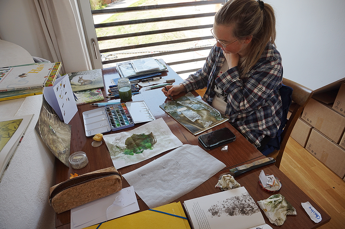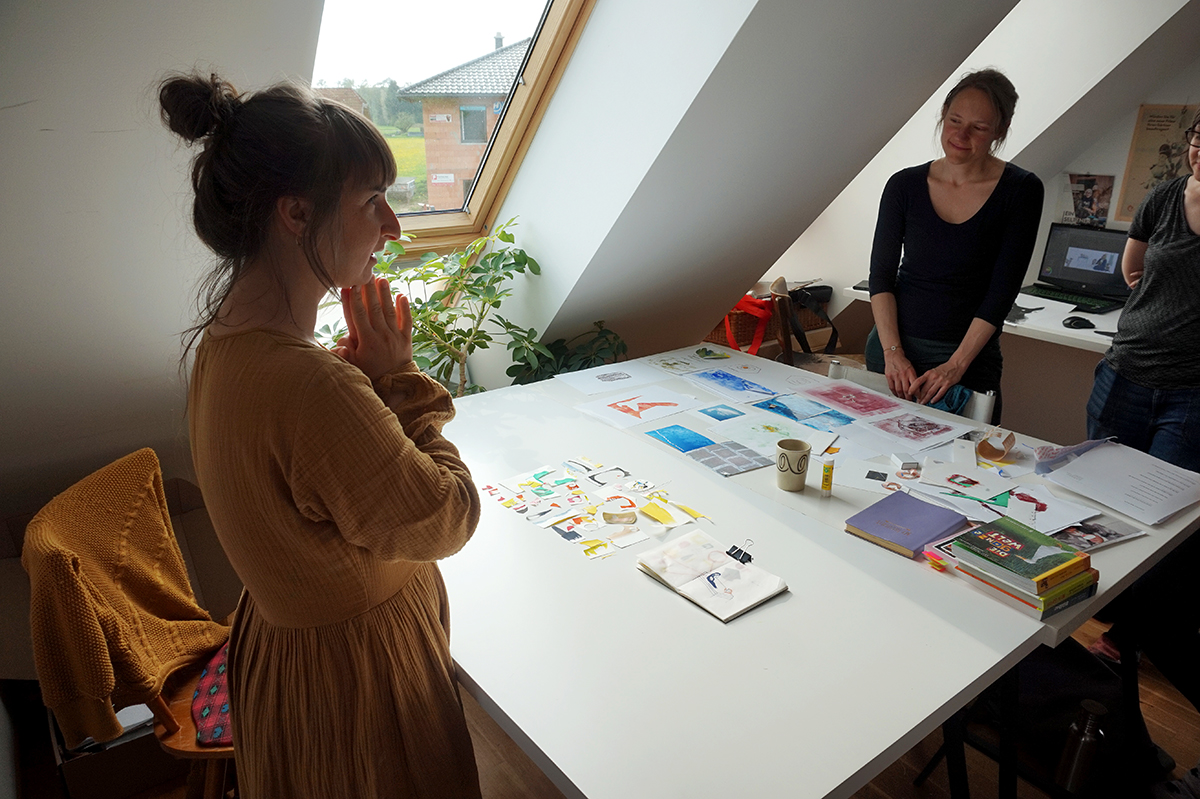 Alle Plätze besetzt, bis zum letzten Tisch – tolle Arbeitsstimmung, intensive Gespräche, auch abseits der Buchbesprechungen im Plenum, und darüber hinaus auch viel Spaß. Ganz gleich welches Wetter draußen ist, drinnen in den Räumen sind die Ideen und Gedanken förmlich greifbar und die Abschlusspräsentation entsprechend interessant. Ob gemalt, gedruckt, collagiert oder in einer anderen Technik erstellt, neben dem Illustrieren gabs auch Muße, um Bücher zu genießen oder gemütlich zu recherchieren.