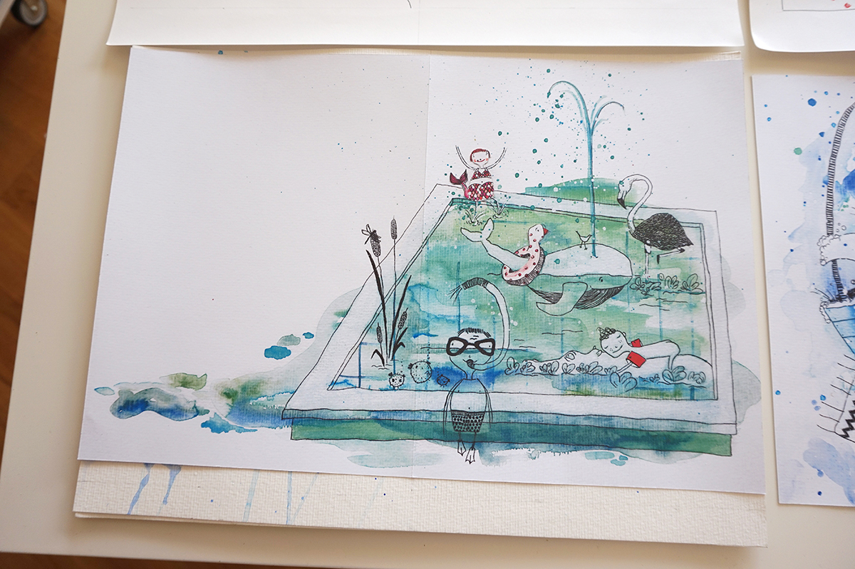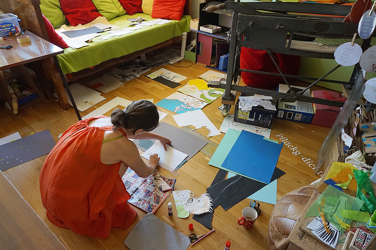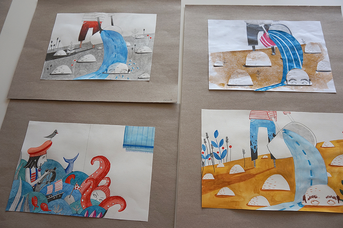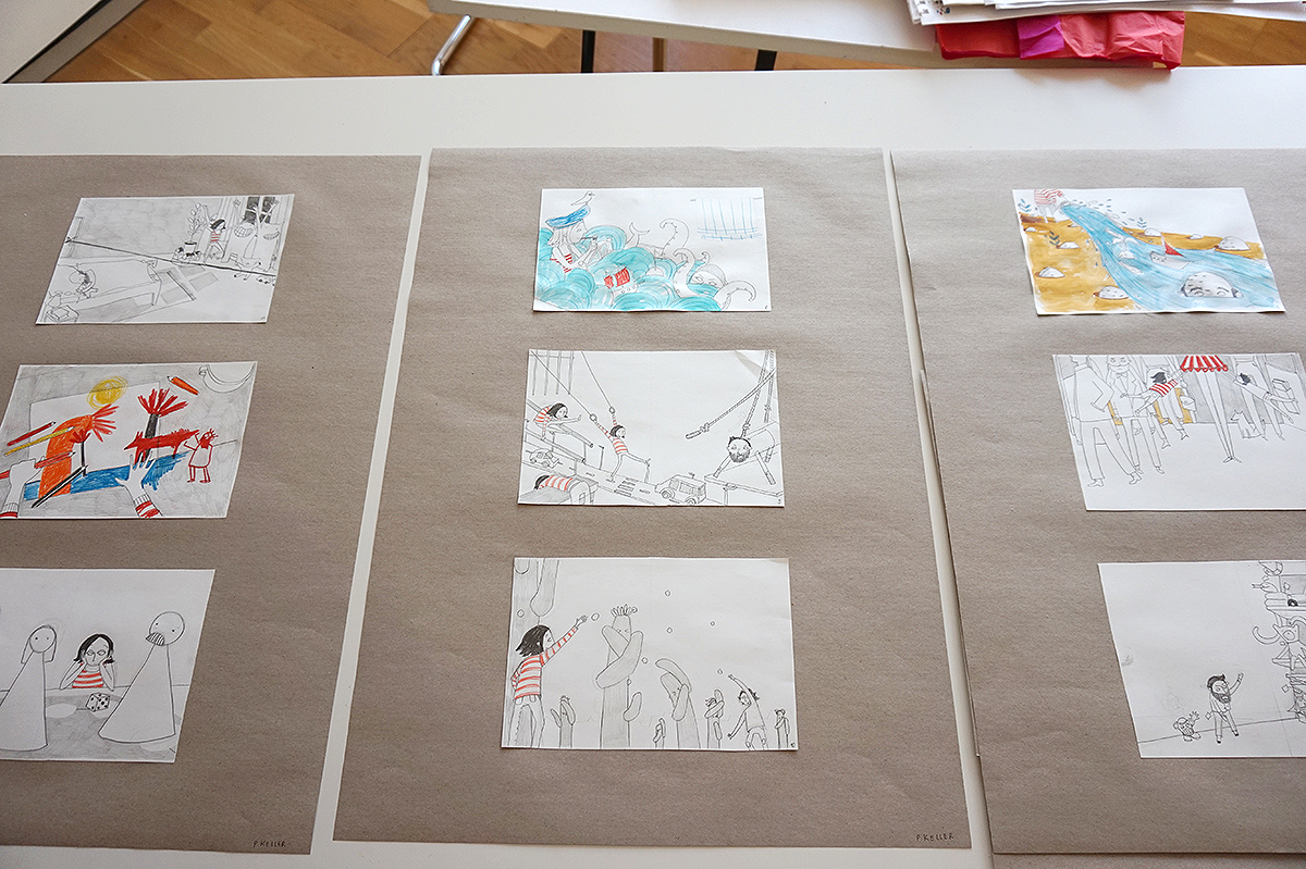 Für den Text „Wir wollen doch nur spielen“ von Berenike Oppermann wurden in Kooperation mit der St. Nikolausstiftung Wien sowie dem Tyrolia Verlag fünf Personen nach einer Ausschreibung zur Sprungbrettwoche eingeladen. Alle entwickelten ihre eigene Umsetzung in Bildern in sehr unterschiedlichen Bildsprachen. Die Autorin konnte bei ihrem Besuch im Kinderbuchhaus zusammen mit Gabriele Zwick/St. Nikolausstiftung und Kathrin Feiner und Inge Cevela/Tyrolia Verlag alle Teilnehmenden kennenlernen und die Präsentation der Projekte persönlich besprechen.
