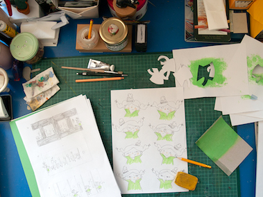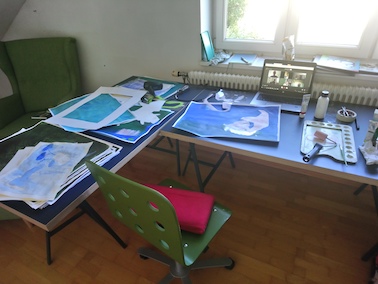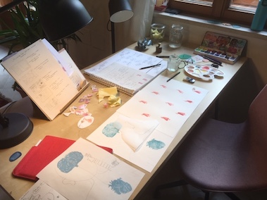 Die wenigen kostbaren Tage der Zweitimpulse nutzte eine kleine Gruppe von engagierten Illustratorinnen für U-Bahn-Fahrende, das Walrass, spielende Geschwister, Gehirnwindungen und nicht zuletzt für die Arbeit an Leben und Tod, nicht mehr und nicht weniger. Bereits begonnen, zum Teil auch schon weiter fortgeschritten, die Projekte wuchsen und gediehen. Es wurden alle Möglichkeiten ausgeschöpft, die via technischer Kommunikation möglich waren und zum Abschluss gabs als Überraschung noch ein Foto der Arbeitstische, an denen jede Person „allein“ gearbeitet hatte.