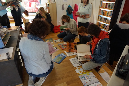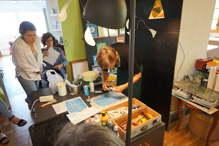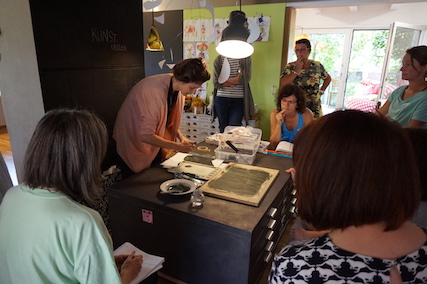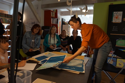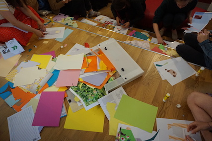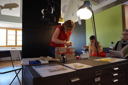 Montag war der Tag mit Karoline Golser und Collagen, Dienstag Leonora Leitl zu Gast, zusammen mit Willy Virus. Mittwoch zeigte Sigrid Eyb-Green Schablonentechnik im Kinderbuchhaus und Donnerstag Julie Völk Cyanotypie.