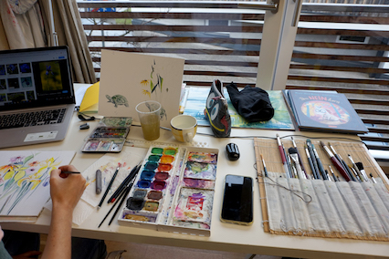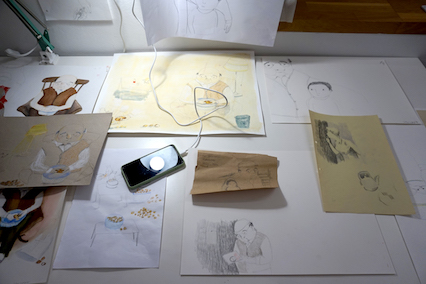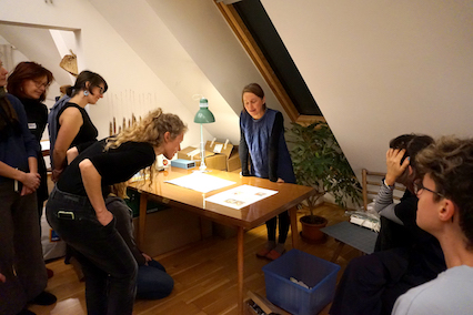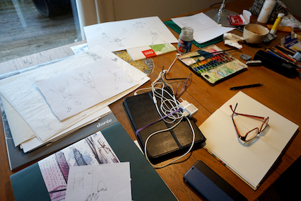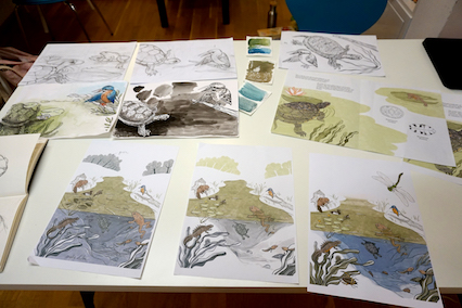 Draußen kalt, drinnen heimelig warm, die Tage begonnen mit kleinen Fingerübungen und dann mit der Arbeit am eigenen Projekt verbracht: einem Sachbuch über die europäische Sumpfschildkröte, einem weiteren über Forschungsprojekte in der Restaurierung und einigen Bilderbuchprojekten in unterschiedlichen Phasen der Ausarbeitung. Da gabs eins mit Schildkrötenhabitat, ein Spechtbuch, eins mit einer Schnecke, eins mit einem großen Wohnhaus und auch eins mit einem Opa. Und noch ein paar mehr ...