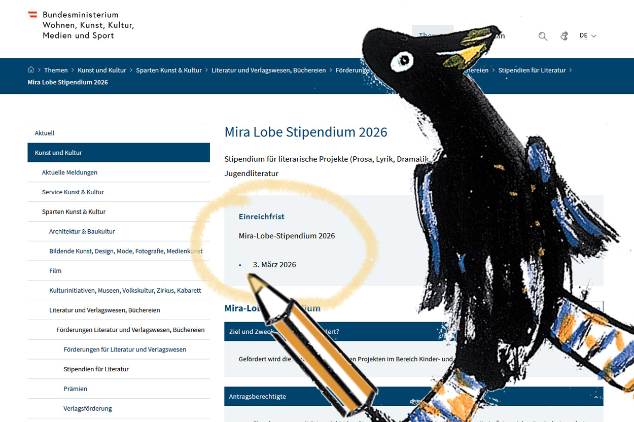 Bis zum 3. März 2026 ist es möglich noch nicht abgeschlossene literarische Projekte im Bereich Kinder- und Jugendliteratur wie Illustration, Prosa, Lyrik oder Dramatik für eine Förderung durch das Bundesministerium einzureichen. Alle Informationen findet ihr